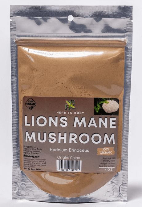 Herb to Body Organic Lion Mane Mushroom Powder is made from Hericium Erinaceus, a prized medicinal mushroom known for cognitive support. This 4oz package of organic mushroom powder provides a convenient way to enjoy the benefits of lion’s mane for mental clarity and overall well-being.